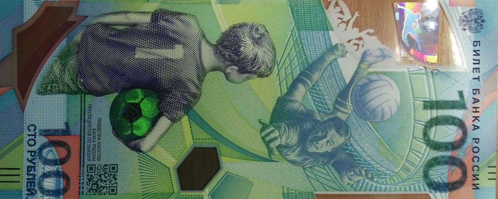 Это первая полимерная купюра в РФ. На неё нанесли логотип и эмблему ЧМ-2018, которые можно различить, если смотреть в ультрафиолетовом свете