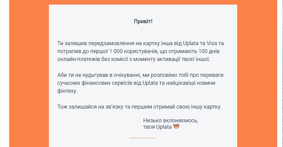Уже весной мы увидим очень необычный продукт. Стартап Uplata предоставит анонимные карты Visa Інша. Получить эту карту можно будет, оставив заявку на сайте uplata.ua или купив её в одном из магазинов-партнёров. Активация карты будет происходить путём отправки смс на короткий номер.
