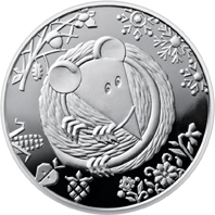 На реверсе монеты изображен символ восточного календаря 2020 — свернутой в клубок крысы, которую окружают по кругу стилизованные символы: снежинки (вверху справа), цветки (внизу справа), плоды (внизу слева), ветви (вверху слева).