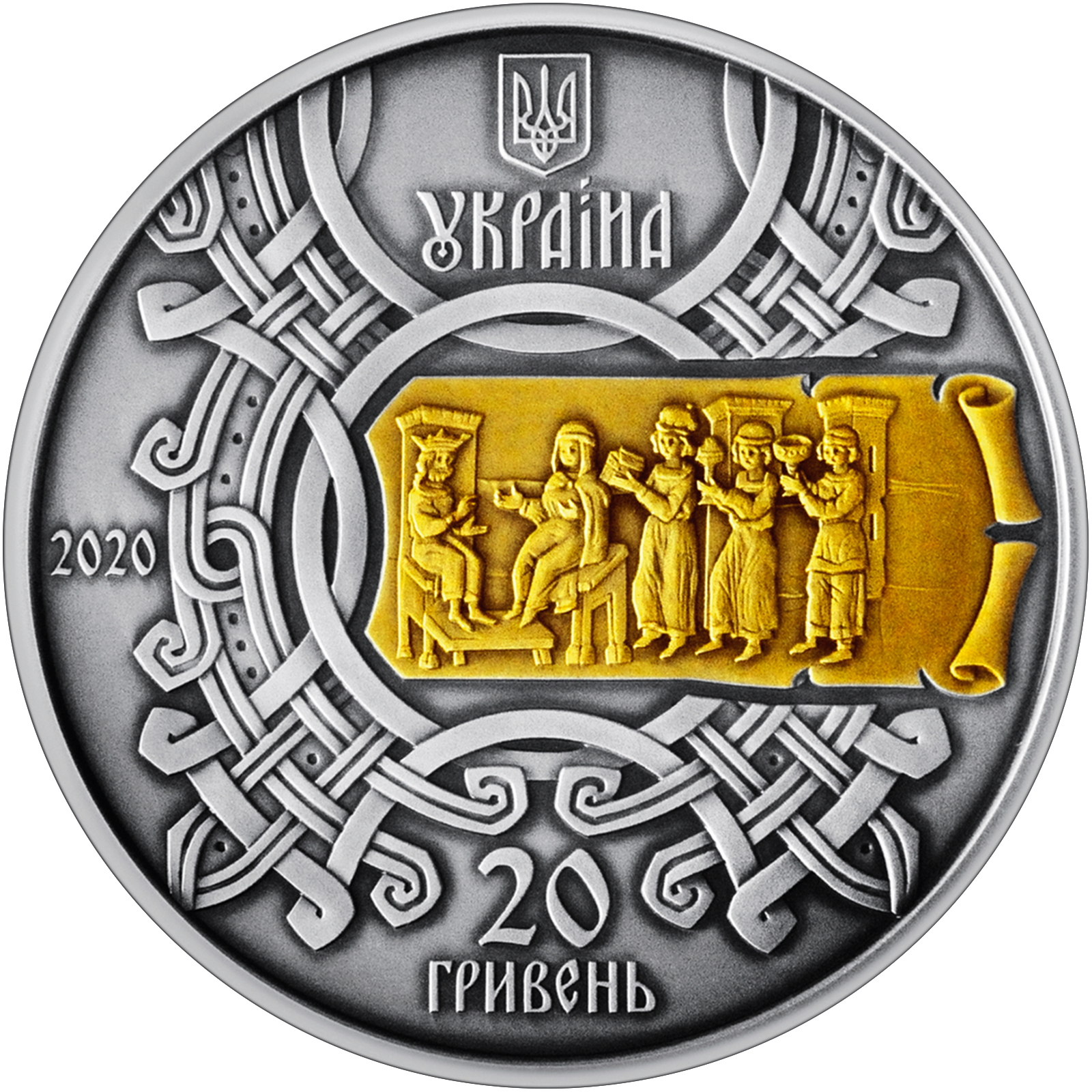 На аверсе монеты размещено: вверху – малый Государственный Герб Украины, под которым надпись – УКРАИНА; слева год чеканки монеты – 2020; внизу номинал монеты – 20/ГРИВЕНЬ; в центре на фоне декоративного орнамента времен Киевской Руси – стилизованное позолоченное изображение фрагмента летописной миниатюры (локальная позолота, содержание золота в чистоте не менее 0,001 г).