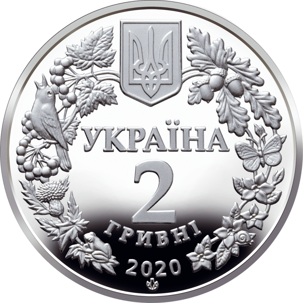 На аверсе монеты из нейзильбера в обрамлении венка, образованного из изображений отдельных видов флоры и фауны, размещены малый Государственный Герб Украины и надписи: УКРАИНА/2/ГРИВНИ/2020 и логотип Банкнотно-монетного двора Национального банка Украины.