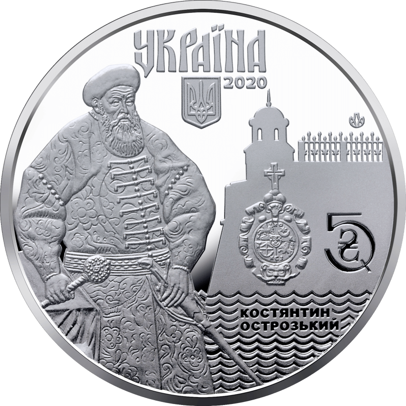 На аверсе монеты размещено: вверху надпись УКРАИНА, под которой – малый Государственный Герб Украины и справа год чеканки монеты – 2020; слева на зеркальном фоне изображён Константин Острожский, справа от которого – герб Острожских и номинал монеты – 5 – на фоне стилизованного Дубенского замка; внизу справа на фоне стилизованных волн надпись – КОНСТАНТИН/ ОСТРОЖСКИЙ; логотип Банкнотно-монетного двора Национального банка Украины (справа).