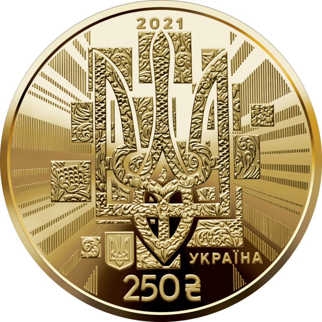 На аверсе монеты в центре мозаичное, украшенное растительным орнаментом, изображение Знака княжеского государства Владимира Великого — трезубца как символ процесса становления государства, способствующего консолидации и развитию украинской нации, её исторического сознания, традиций и культуры, над которым — год чеканки монеты — 2021 малый Государственный Герб Украины (внизу слева) надпись УКРАИНА (внизу справа) номинал монеты — 250 и графический символ гривны (внизу на зеркальном фоне).