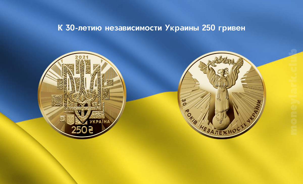 Монета «К 30-летию независимости Украины» номиналом 250 гривен входит в серию «Возрождение украинской государственности» и была выпущена в обиход 17 августа 2021 года.
