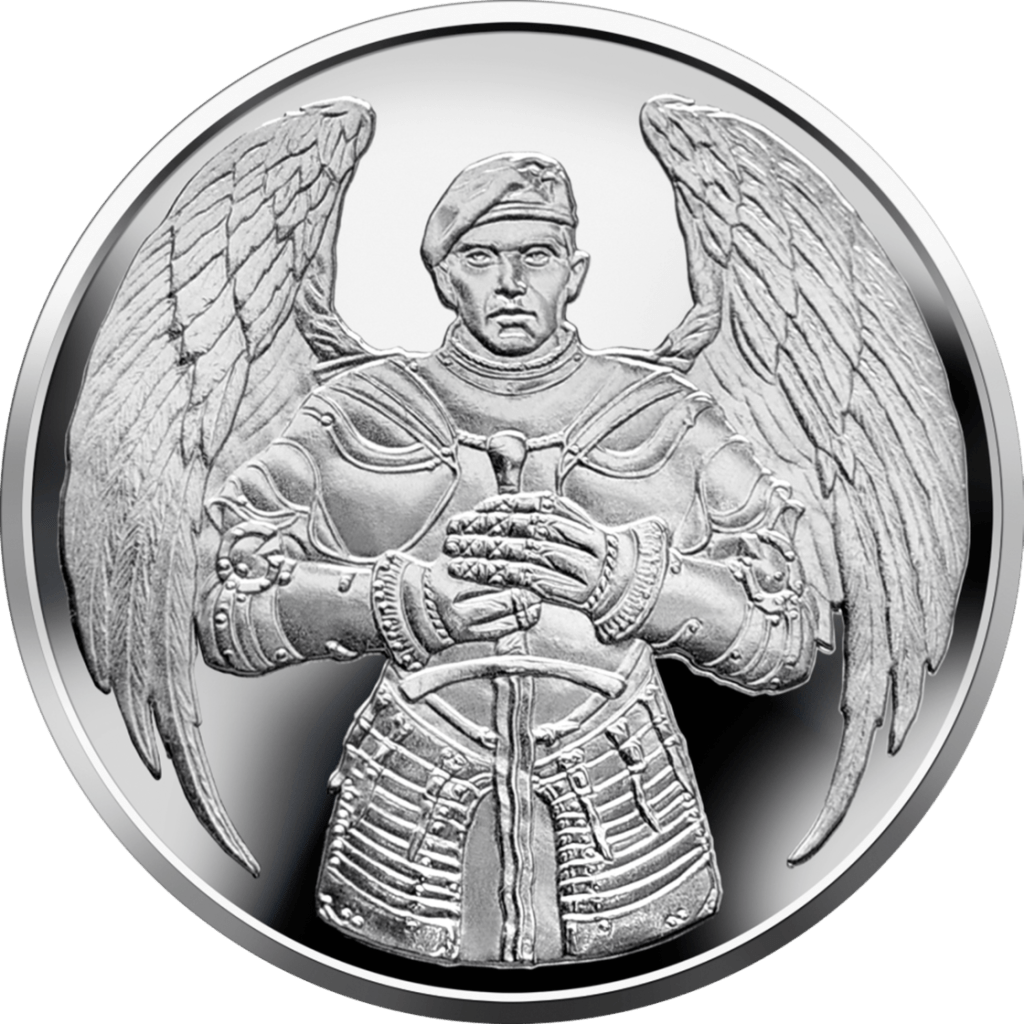 На реверсе на зеркальном фоне изображен символический образ воина-десантника в рыцарских доспехах, за спиной которого полураскрытые крылья – символ покровителя войска – Архангела Михаила.