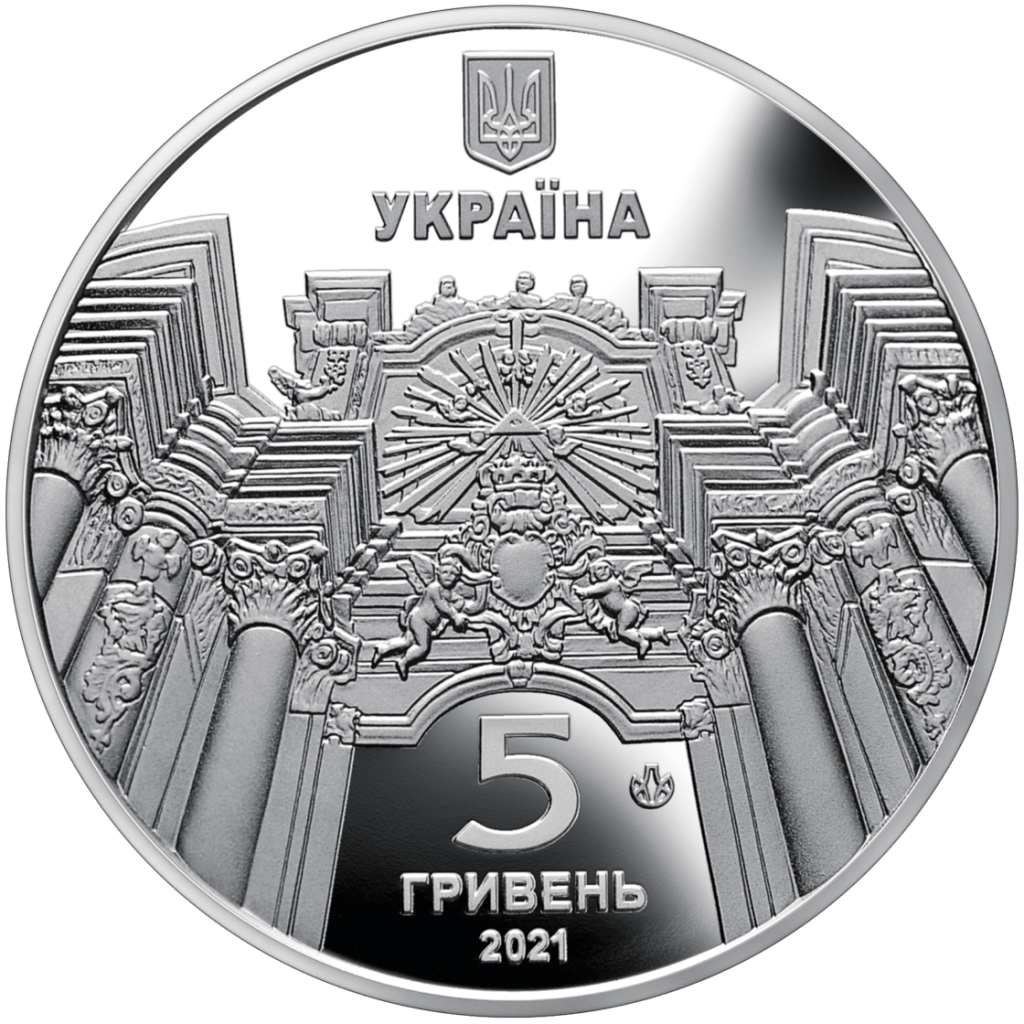 На аверсе монеты размещены: малый Государственный Герб Украины, под которым размешена надпись УКРАИНА; фрагмент интерьера центрального нефа, внизу на зеркальном фоне номинал монеты и год чеканки – 5/ГРИВЕН/2021; логотип Банкнотно-монетного двора Национального банка (внизу справа).
