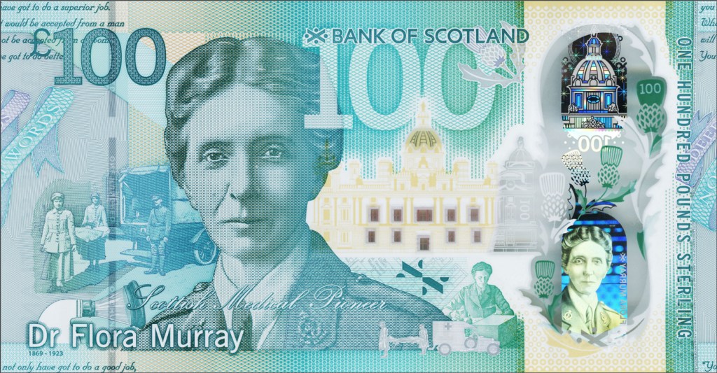 Реверс посвящён героине шотландцев — Флоры Мюррей. Когда в 1914 году началась война, женщины во главе с Мюррей основали Женский больничный корпус, феминистскую организацию, и открыли во Франции два успешных военных госпиталя, полностью укомплектованных женщинами-суфражистками. В 1915 году британское военное министерство предоставило им помещение в Лондоне и попросило Мюррей вернуться для организации процесса. Там было вылечено более 50 000 тяжелораненых солдат и спасли бесчисленное количество жизней.