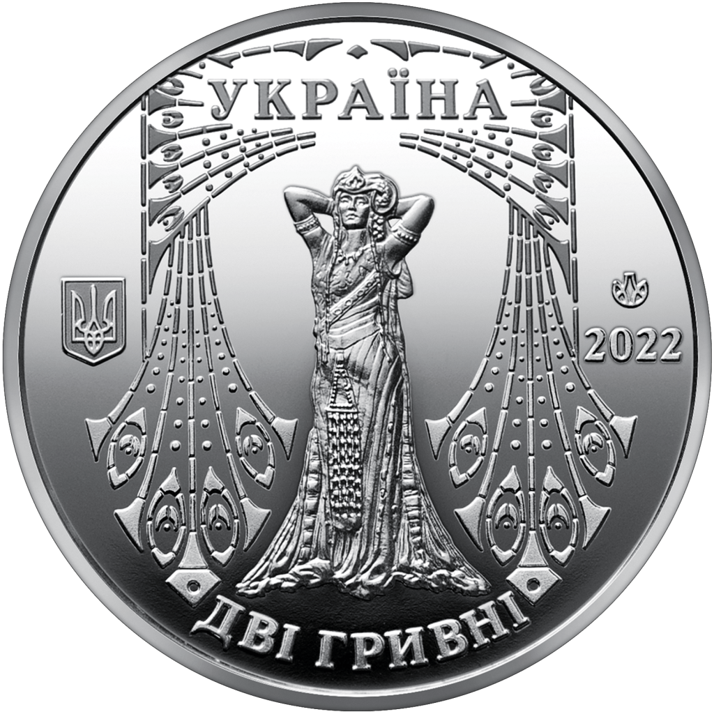 На аверсе монеты размещены: в центре – изображение Соломии Крушельницкой в ​​сценическом образе Аиды, по обе стороны которой стилизованные кулисы, украшенные декоративным орнаментом, слева – малый Государственный Герб Украины; надписи: УКРАИНА (вверху, на фоне декоративного орнамента), 2022 (справа), ДВЕ ГРИВНЫ (внизу); логотип Банкнотно-монетного двора Национального банка Украины (справа, над годом чеканки монеты).