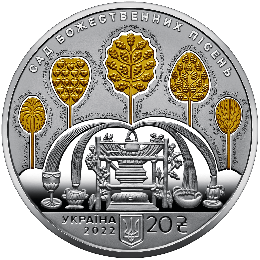 На аверсе монеты размещено: внизу – малый Государственный Герб Украины, слева от которого надписи: УКРАИНА и год чеканки монеты 2022; справа – номинал 20 и графический символ гривны; основная композиция аверса – символический стилизованный фонтан, являющийся аллегорией Бога, наполняющей водой различные сосуды, метафоры человека и человеческой души. С одной стороны, они все разного размера, следовательно, не равны. С другой – все они наполнены, поэтому равны. Каждый сосуд имеет разный объем, но получает достаточно воды для своего наполнения (пластическое воплощение графического рисунка Г. Сковороды «Неровное всем равенство…»). Над животворным фонтаном «прорастают райские» деревья (элемент украшения — локальная позолота), формирующие сад божественных песен, вокруг которых «растекаются» строки из сборника «Сад божественных песен»: КАЖДОМУ ГОРОДУ — ОБЫЧАЙ И ПРАВА, ВСЯКАЯ ДЕРЖИТ СВОЙ УМ ГОЛОВА; КАЖДОМУ СЕРДЦУ – ЛЮБОВЬ И ТЕПЛО, ВСЯКОЕ ГОРЛО СВОЙ ВКУС НАШЛО. Я ЖЕ В ПЛЕНУ НАВЯЗЧИВЫХ ДУМ: ТОЛЬКО ОДНО БЕСПОКОИТ МОЙ УМ… ЗНАЮ, ЧТО СМЕРТЬ – КАК КОСА ЗАМАШИСТА, ДАЖЕ ЦАРЯ НЕ ОБОЙДЕТ ОНА. БЕЗРАЗЛИЧНО СМЕРТИ, МУЖИК ТО ИЛИ ЦАРЬ, – ВСЕ ПОЖРЁТ, КАК СОЛОМУ ПОЖАР. КТО ЖЕ ПРЕНЕБРЕЖЁТ СТРАШНОЙ ЕЁ СТАЛЬЮ? ТОТ, У КОГО СОВЕСТЬ, КАК ЧИСТЫЙ ХРУСТАЛЬ…; надпись сверху по дуге – САД БОЖЕСТВЕННЫХ ПЕСЕН.