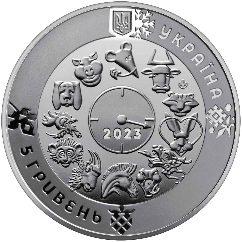 На аверсе монеты размещены: вверху – малый Государственный Герб Украины, справа от которого надпись полукругом УКРАИНА; на зеркальном фоне по кругу изображены 12 символов восточного календаря, в центре круга – стилизованные часы со стрелкой, указывающие на кролика – символ года, под стрелкой – 2023; внизу слева надпись полукругом 5 ГРИВЕН; на матовом фоне изображены стилизованные под украинскую вытинанку символы каждого времени года: снежинка (вверху), цветок (справа), ягода (внизу), листок (слева); логотип Банкнотно-монетного двора Национального банка Украины (слева от символа кролика).