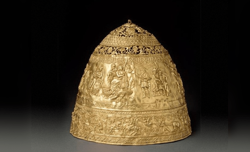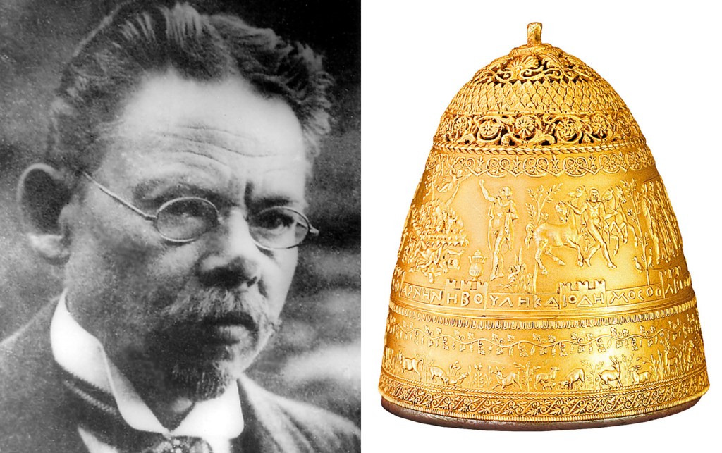 «На столе, излучая мягкое матовое сияние золота, стояла древняя чеканная тиара изумительной работы и превосходной сохранности. Только в одном месте виднелась небольшая вмятина, словно от меча, но украшения вокруг почти не были повреждены. Тиара представляла собой куполообразный парадный шлем-корону, чеканенный целиком из тонкой золотой полосы…» – писали позже профессоры Бруно Бухер и Гуго Лейшинг. Комиссия подтвердила подлинность артефакта, не подозревая, что братья Гохманы специально попросили мастера нанести вмятину и царапины, чтобы шлем выглядел правдоподобнее.