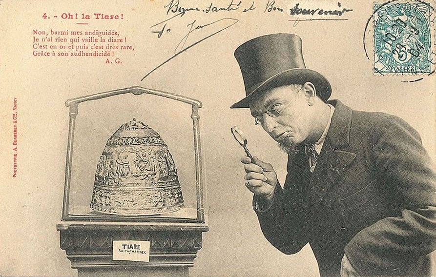 Изобличить мошенников удалось благодаря шутке эпатажного художника и скульптора с Монмартра Эллина Майенса, известного тем, что он сам занимался… подделкой картин. Эпатажный мастер в 1903 году заявил, что тиара является его рук произведением. » Я сделал макет этой короны, а золотых и серебряных дел мастер Бэрон сделал эту корону из чеканного золота под моим руководством», – говорил тот, утверждая, что подделку ему в 1984 году заказал некий господин Шпицен, заплативший за нее 4500 франков.»