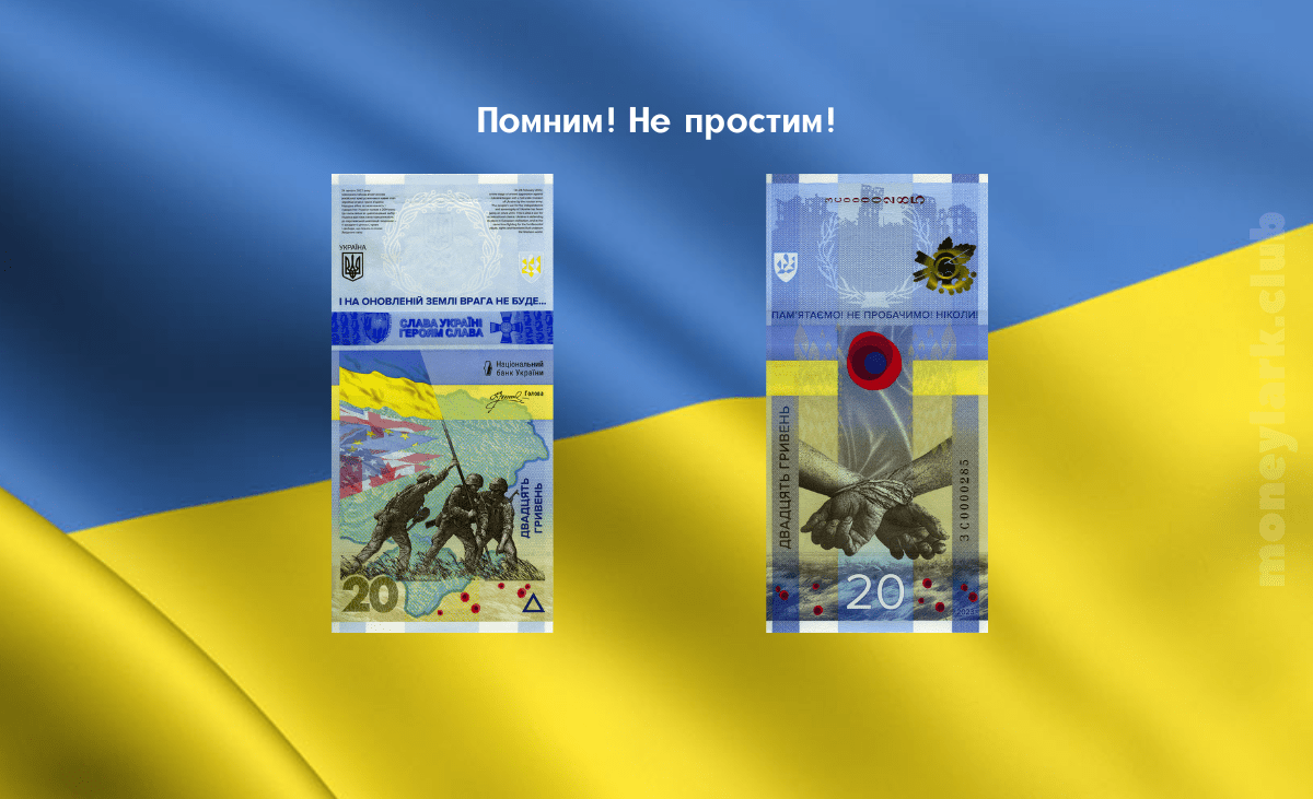 Памятная банкнота «Помним! Не простим!» введена в обращение 23 февраля 2023 года в ознаменование стойкости, несокрушимости, героизма и силы духа украинского народа, которые он проявляет в борьбе против вооруженной агрессии России.