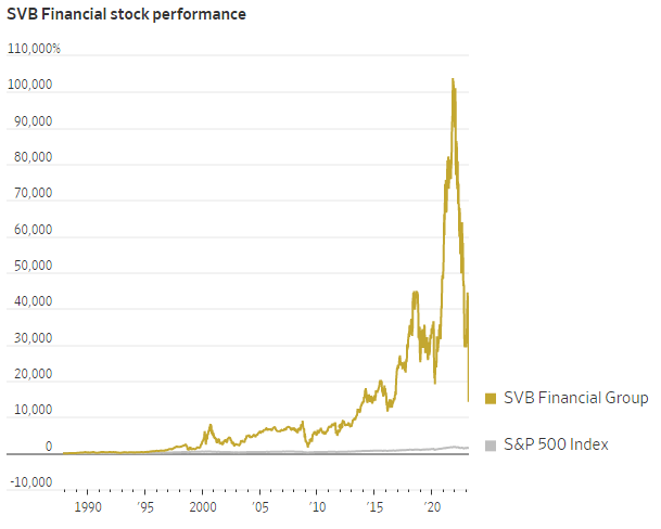 На пике цены акций в 2021 году цены на акции SVB выросли более чем на 100 000% с тех пор, как они впервые вышли на биржу в 1987 году. Даже после резкого падения в прошлом году акции за время своего существования превзошли S&P 500. Банк увеличил вдвое количество персонала.