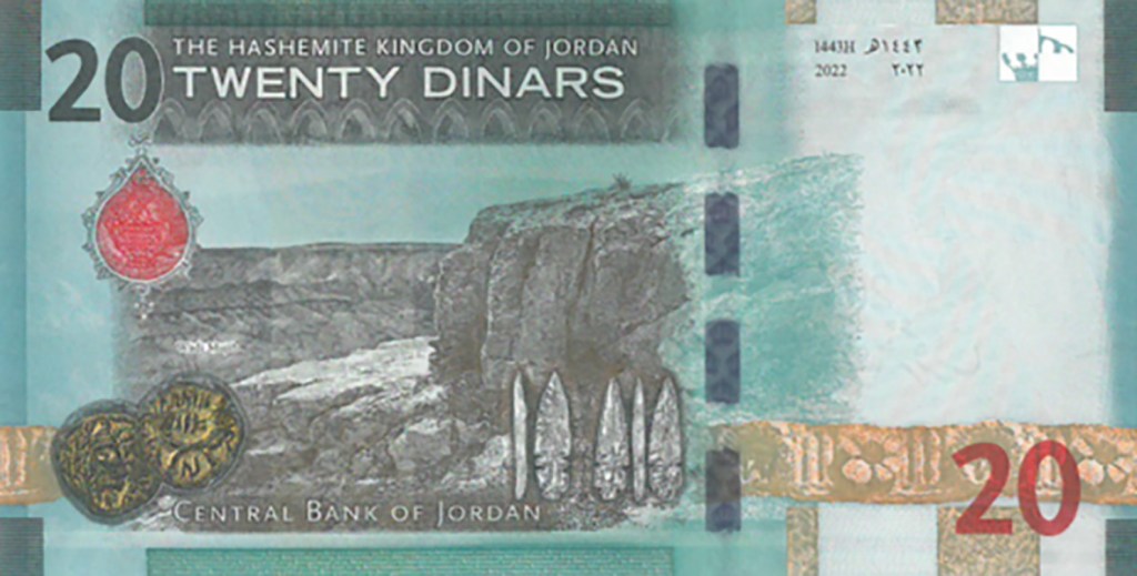 На оборотной стороне JD20 размещён пейзаж предгорий Вади-Муджиб, наконечники копий древнего каменного века и набатейская монета из Петры; английский текст. На обеих сторонах в верхнем углу есть защитный элемент, который при просмотре на свет являет собой корон.