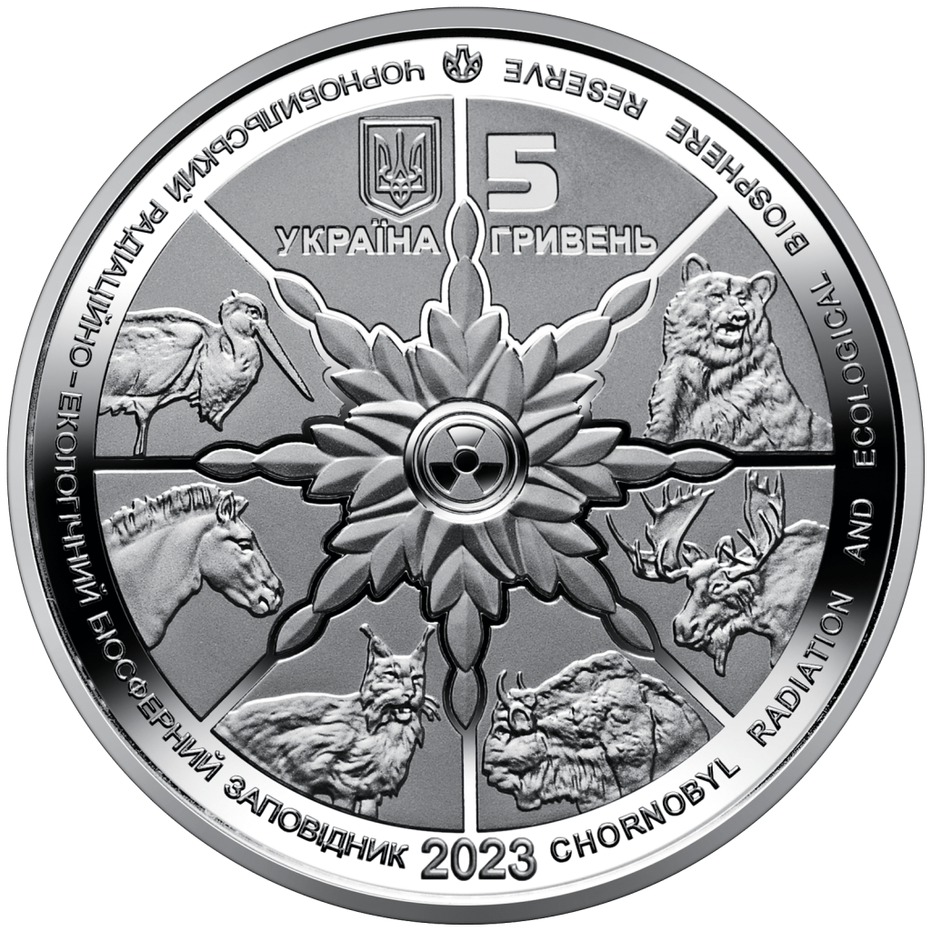 На аверсе монеты размещены: малый Государственный Герб Украины (вверху), надписи: УКРАИНА (под гербом); номинал монеты – 5 / ГРИВЕН (справа от герба); в центре – символическое колесо жизни, знаменующее возрождение природы: стилизованный международный знак «Радиационная угроза», окутанный листьями, вокруг которого животные, популяции которых развиваются в 30-километровой зоне отчуждения, которая стала своеобразной резервацией для размножения, в частности аиста чёрного, лошади, рыси, зубра, лося, медведя бурого; по кругу, на зеркальном фоне надписи: ЧЕРНОБЫЛЬСКИЙ РАДИАЦИОННО-ЭКОЛОГИЧЕСКИЙ БИОСФЕРНЫЙ ЗАПОВЕДНИК (слева), CHORNOBYL RADIATION AND ECOLOGICAL BIOSPHERE RESERVE; год чеканки – 2023 (внизу); логотип Банкнотно-монетного двора Национального банка (вверху).