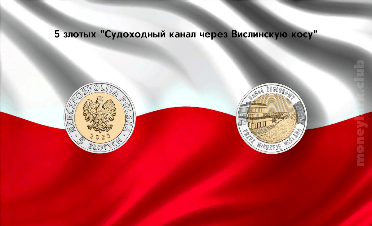 22 мая 2023 г. Национальный банк Польши продолжает серию «Открой для себя Польшу» и вводит в обращение обиходную монету «Судоходный канал через Вислинскую косу» номиналом 5 злотых.