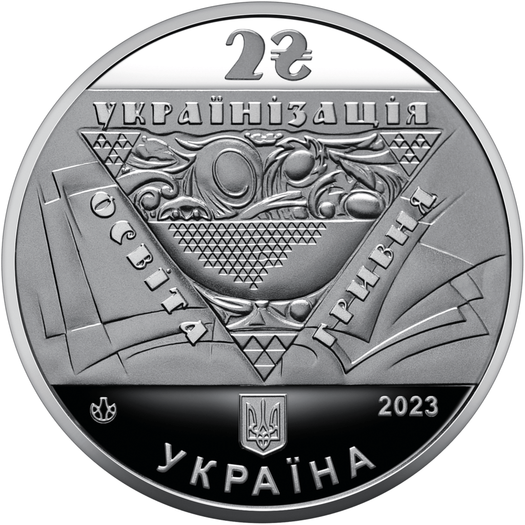 На аверсе монеты размещено: на зеркальном фоне внизу – малый Государственный Герб Украины и надпись УКРАИНА, справа – год чеканки монеты 2023, в центре, на фоне стилизованных развевающихся флагов – треугольник (виньетка Георгия Нарбута), что символизирует определенный культурный, экономический расцвет при правлении гетмана Скоропадского, который обрамляют надписи: УКРАИНИЗАЦИЯ (Вверху), ОБРАЗОВАНИЕ, ГРИВНЯ (с обеих сторон); вверху на зеркальном фоне – номинал 2 и графический знак гривны; внизу – логотип Банкнотно-монетного двора Национального банка Украины (слева).