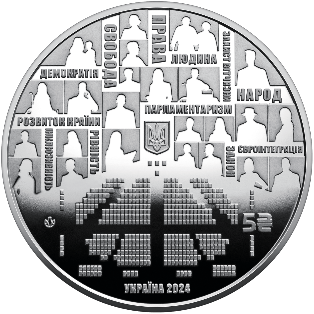 На аверсе монеты в центре композиции размещен малый Государственный Герб Украины. В верхней части вокруг герба изображены стилизованные силуэты современных украинцев, являющихся представителями разных социальных, возрастных и профессиональных групп. Это олицетворяет идею многогранности украинского народа и подчеркивает, что каждый гражданин согласно статье 3 Конституции Украины является высшей социальной ценностью нашего государства. Между силуэтами размещены надписи: ПРАВА, СВОБОДА, ДЕМОКРАТИЯ, ЧЕЛОВЕК, ЗАЩИТА ОТЧИЗНЫ, НАРОД, ПАРЛАМЕНТАРИЗМ, РАЗВИТИЕ СТРАНЫ, ИНКЛЮЗИВНОСТЬ, РАВЕНСТВО, ЕВРОИНТЕГРАЦИЯ и ЗАКОН. Ниже герба изображено узнаваемое всеми украинцами информационное табло для отображения в сессионном зале Верховной Рады результатов голосования, под которым указана надпись УКРАИНА и год чеканки – 2024, слева – логотип Банкнотно-монетного двора Национального банка Украины, справа – номинал 5 гривен.