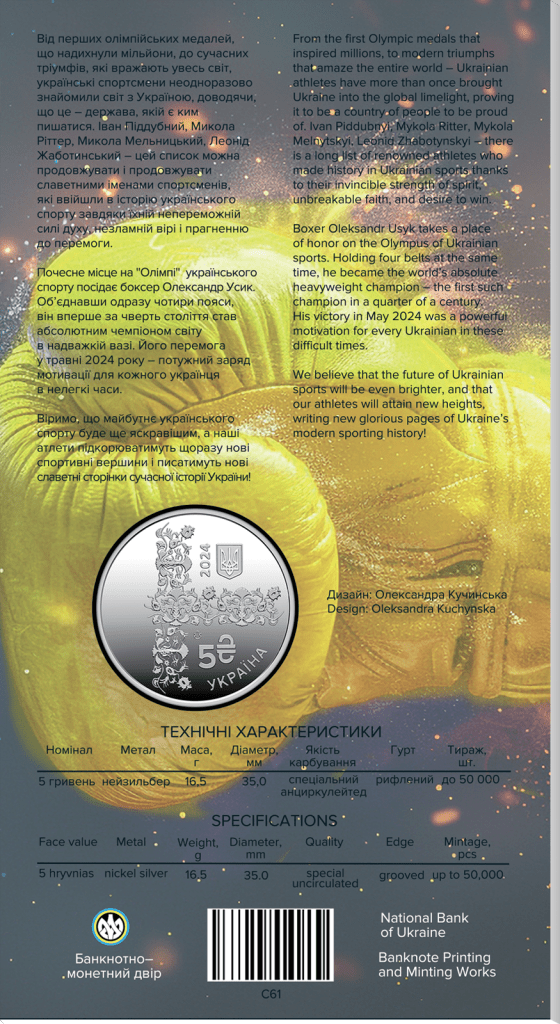На аверсе монеты на зеркальном фоне изображен традиционный крымскотатарский орнамент, символизирующий крымские корни Александра Усика. Этот узор, тщательно подобранный и использованный украинским дизайнером Эльвирой Гасановой в одном из образов спортсмена на «битве взглядов» перед поединком за титул абсолютного чемпиона мира, дополнительно подчеркивает неразрывную связь Крыма с Украиной. Вверху справа от орнамента размещен год чеканки – 2024 и малый Государственный Герб Украины. Внизу справа – надпись УКРАИНА, номинал 5 с графическим символом гривны, а также логотип Банкнотно-монетного двора Национального банка Украины.