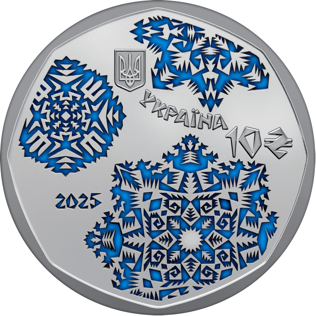 На аверсе монеты размещен изящный декоративный узорчатый мотив в виде снежинок, которые традиционно используются для украшения зимних окон. В верхней части монеты между снежинками изображен малый Государственный Герб Украины, номинал 10 и графический символ гривни, а также надписи УКРАИНА / 2025.