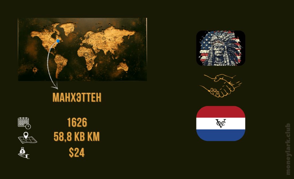 В 1626 году губернатор колонии Новые Нидерланды Петер Минёйт выкупил остров у индейского племени ленапе. В качестве оплаты использовались различные товары, включая бижутерию, одежду и ножи. Общая стоимость переданных предметов составила около 60 гульденов — по современным меркам это примерно 24 доллара.