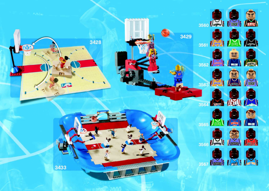 Особенно популярным стал набор LEGO 3433 «Ultimate NBA Arena», который включал полноценное баскетбольное поле и 10 игроков.