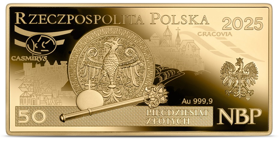 В центральной части аверса расположено стилизованное изображение орла с величественной печати короля Казимира III Великого, а ниже — королевские регалии: держава и скипетр. Слева от орла размещён стилизованный фрагмент панорамы Казимежа с надписью CASMIRVS, над которым изображён овал с элементами короны. Справа от орла находится стилизованный фрагмент панорамы Кракова с надписью CRACOVIA. По бокам композиции расположены декоративные ленты. В верхней части указано название государства: РЕСПУБЛИКА ПОЛЬША, а справа обозначен год выпуска: 2025. В нижней части, на фоне прямоугольной поверхности с орнаментом, слева указан номинал: 50, а справа — надпись: ПЯТЬДЕСЯТ ЗЛОТЫХ. В правом нижнем углу размещены буквы: НБП. В верхней части изображён орёл, являющийся гербом Республики Польша. Под орлом справа находится знак монетного двора: m/w, а слева — надпись: Au 999,9.