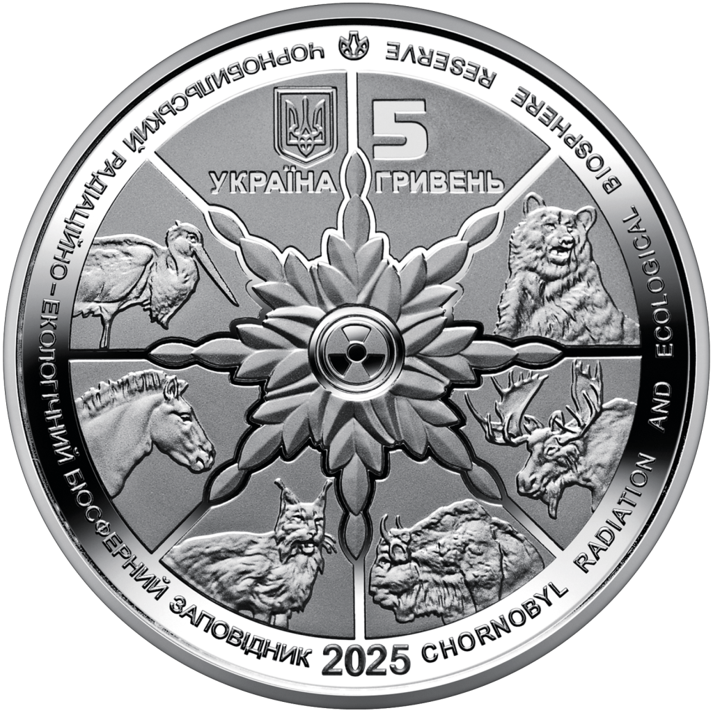На аверсе монеты размещены: малый Государственный Герб Украины (вверху), надписи: УКРАИНА (под гербом); номинал монеты – 5 / ГРИВЕН (справа от герба); в центре – символическое колесо жизни, знаменующее возрождение природы: стилизованный международный знак «Радиационная угроза», окутанный листьями, вокруг которого животные, популяции которых развиваются в 30-километровой зоне отчуждения, которая стала своеобразной резервацией для размножения, в частности аиста чёрного, лошади, рыси, зубра, лося, медведя бурого; по кругу, на зеркальном фоне надписи: ЧЕРНОБЫЛЬСКИЙ РАДИАЦИОННО-ЭКОЛОГИЧЕСКИЙ БИОСФЕРНЫЙ ЗАПОВЕДНИК (слева), CHORNOBYL RADIATION AND ECOLOGICAL BIOSPHERE RESERVE; год чеканки – 2025 (внизу); логотип Банкнотно-монетного двора Национального банка (вверху).