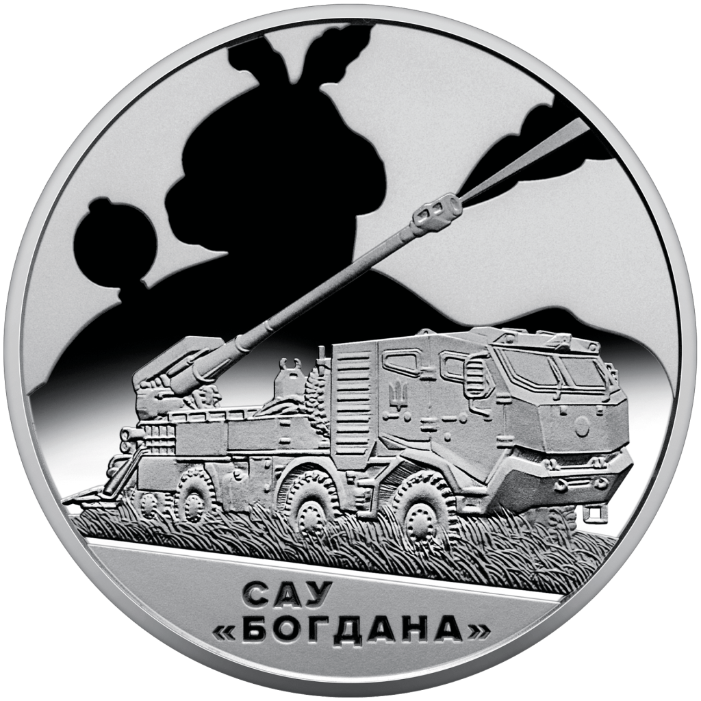 В композиции реверса монеты доминирует изображение САУ «Богдана» в боевом положении на степной местности, что подчеркивает её мобильность и эффективность в различных боевых условиях. В нижней части расположена надпись «САУ ‘БОГДАНА'», подчеркивающая значение этой артиллерийской системы в современных боевых действиях. Силуэт Богдана Хмельницкого позади техники символизирует связь традиций украинского воинства с современными технологиями защиты государства.
