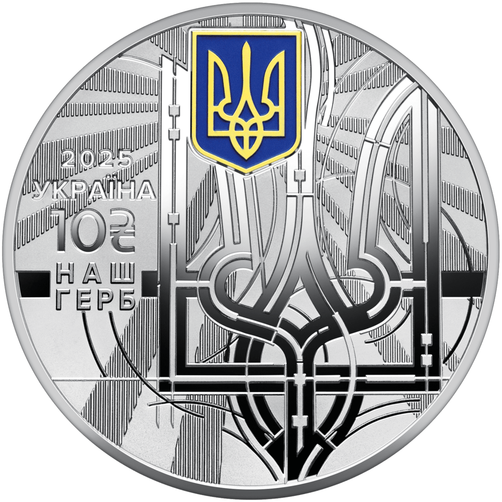 На аверсе монеты размещены: вверху — малый Государственный Герб Украины золотой трезубец на синем щите, выполненный с использованием эмали и локальной позолоты. На фоне расходящихся лучей размещена стилизованная схема построения трезубца, воспроизводящая знак Княжеского Государства Владимира Великого. Слева от композиции расположены надписи: «2025», «УКРАИНА», «10», «НАШ», «ГЕРБ».