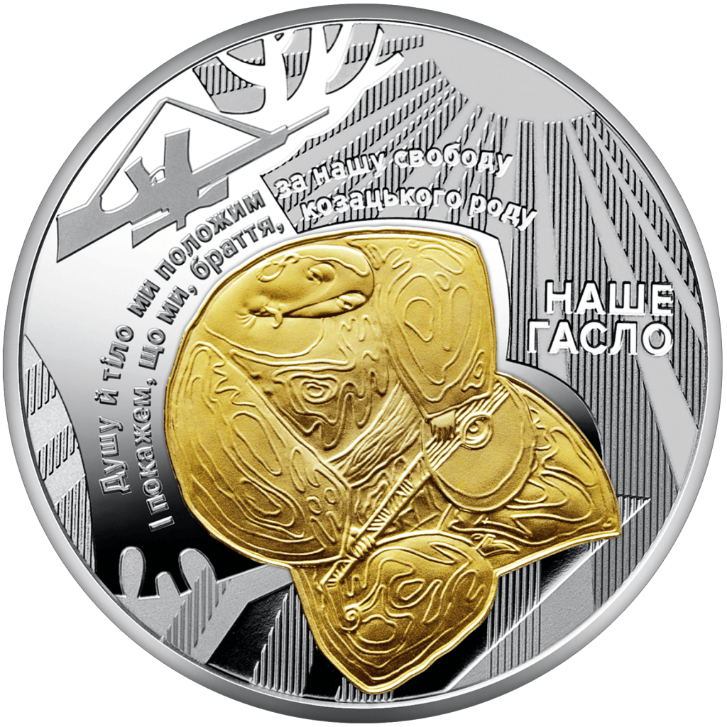 На реверсе в обрамлении лучей изображён казак Мамай (с элементом отделки — локальной позолотой), сидящий под раскидистым дубом. Этот многогранный образ свободного человека — защитника, воина, путешественника и искусного всадника — олицетворяет несгибаемую ментальность украинского народа и символизирует вечного защитника Украины. Над фигурой казака полукругом выгравированы строки украинского гимна: «ДУШУ Й ТІЛО МИ ПОЛОЖИМ ЗА НАШУ СВОБОДУ І ПОКАЖЕМ, ЩО МИ, БРАТТЯ, КОЗАЦЬКОГО РОДУ» («ДУШУ И ТЕЛО МЫ ПОЛОЖИМ ЗА НАШУ СВОБОДУ И ПОКАЖЕМ, ЧТО МЫ, БРАТЬЯ, КОЗАЦКОГО РОДУ») Справа от изображения размещена лаконичная, но ёмкая надпись: «НАШЕ ГАСЛО» («НАШ ЛОЗУНГ»), завершающая композицию и подчёркивающая непреходящую ценность свободы и национальной принадлежности.