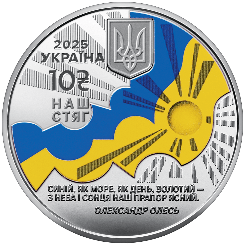 На аверсе изображён малый Государственный Герб Украины, расположенный в верхней части. На фоне стилизованных лучей развевается сине-жёлтый флаг, выполненный с использованием цветной печати, что придаёт ему динамику и яркость. Слева от композиции размещены надписи: «2025», «УКРАИНА», «10», «НАШ СТЯГ». В нижней части аверса приведены строки из стихотворения Александра Олеся: «СИНІЙ, ЯК МОРЕ, ЯК ДЕНЬ, ЗОЛОТИЙ — З НЕБА І СОНЦЯ НАШ ПРАПОР ЯСНИЙ» («СИНИЙ, КАК МОРЕ, КАК ДЕНЬ, ЗОЛОТОЙ — С НЕБА И СОЛНЦА НАШ ФЛАГ ЯСНЫЙ»).