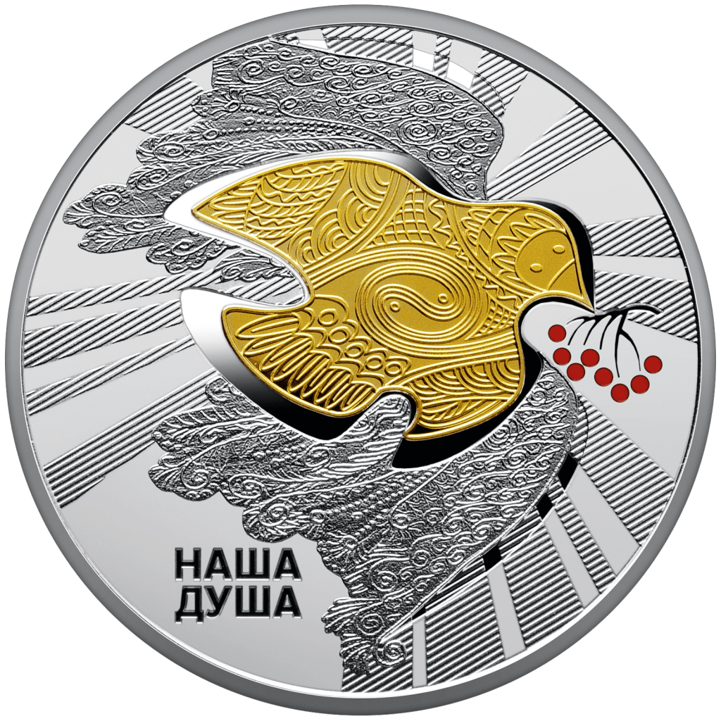 На реверсе в обрамлении лучей рельефно изображена стилизованная птица, украшенная орнаментом с использованием локальной позолоты. Птица держит в клюве кисть калины, символизируя свободолюбивую и независимую украинскую душу. В нижней части монеты размещена лаконичная надпись: «НАША / ДУША», завершающая художественный замысел и усиливая символическую связь между природой, народом и его стремлением к свободе.