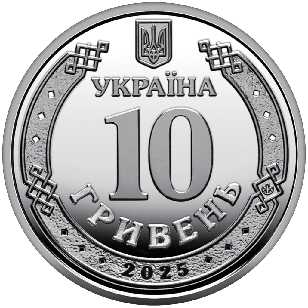На аверсе монеты изображён малый Государственный Герб Украины (наверху); в обрамлении древнеруського орнамента по центру размещены надписи: УКРАИНА / 10 / ГРИВЕНЬ (полукругом); на фоне орнамента указан год чеканки монеты — 2025 (внизу) и логотип Банкнотно-монетного двора Национального банка Украины (справа).