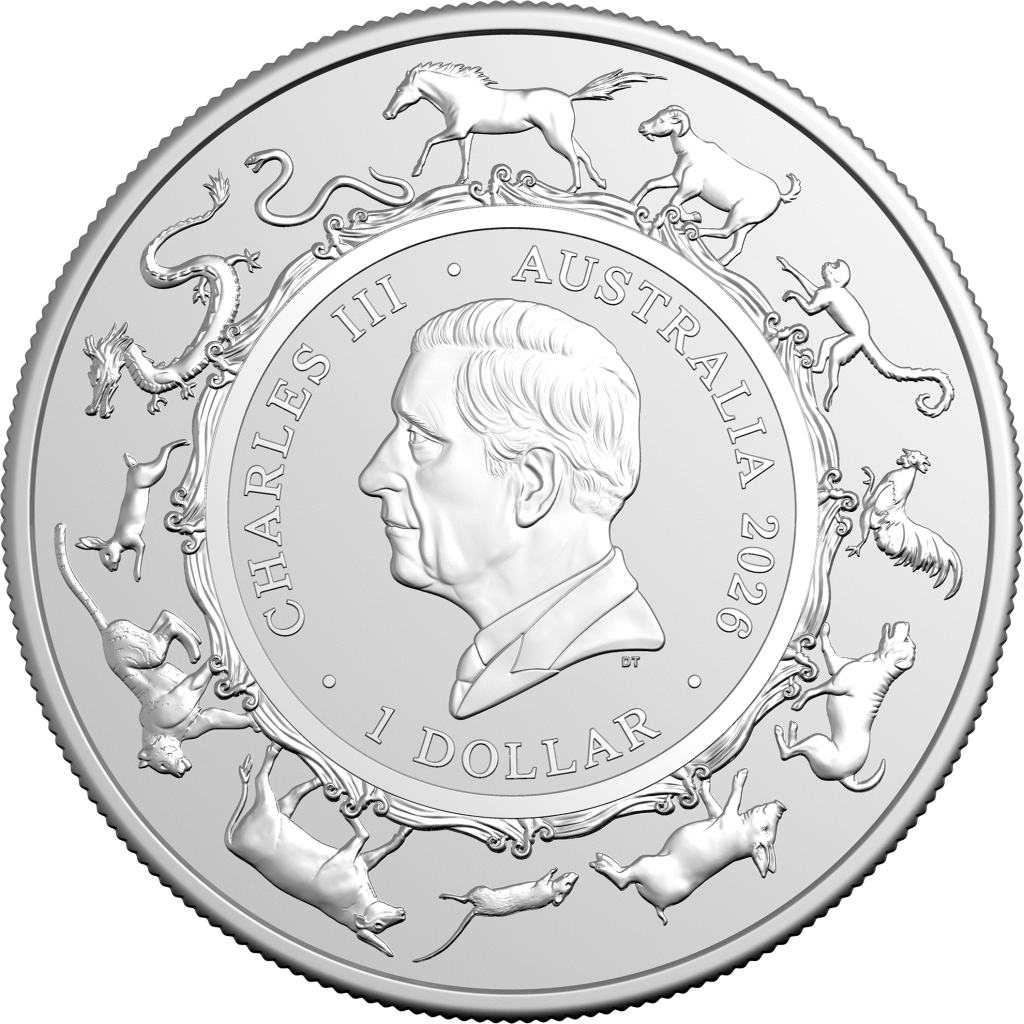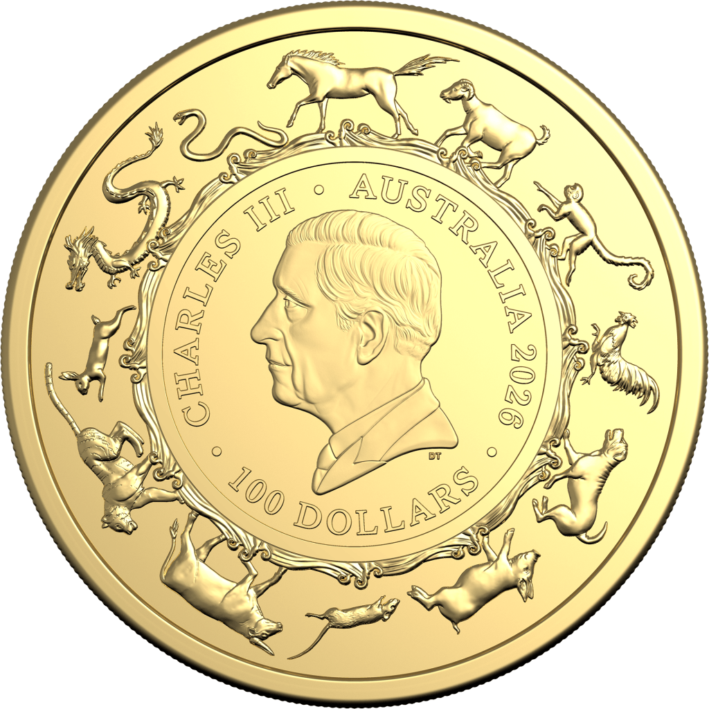 На аверсе монеты в центре помещён портрет Чарльза III. Вверху полукругом размещены надписи CHARLES III (ЧАРЛЬЗ III), AUSTRALIA (АВСТРАЛИЯ) и год выпуска 2026. Внизу полукругом указан номинал — 100 долларов. По внешнему кругу монеты указаны изображения двенадцати животных, соответствующих символам Восточного календаря.
