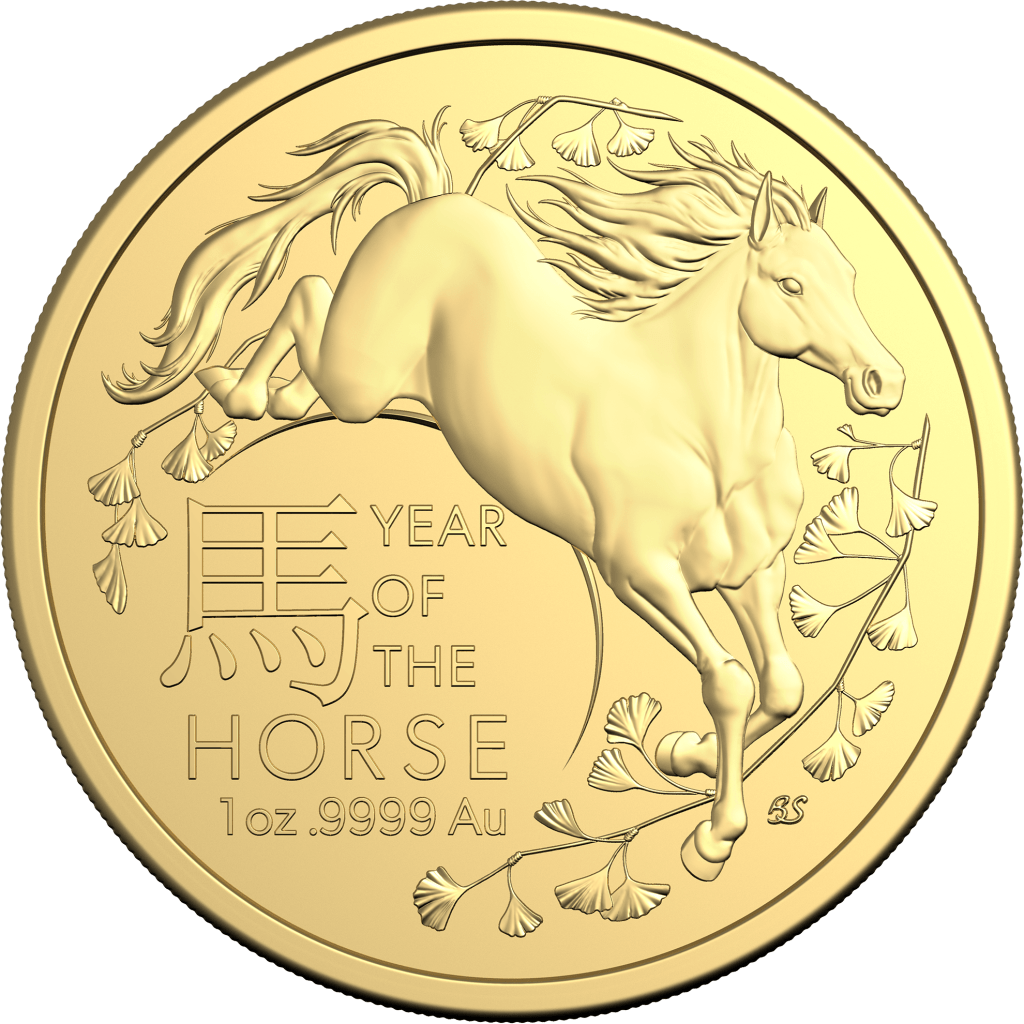 На реверсе изображена свободолюбивая лошадь среди листьев гинкго, символизирующая надежду, силу и стойкость. Под лошадью слева размещён китайский иероглиф, означающий саму лошадь как животное китайского зодиака и соответствует земной ветви. Также надпись YEAR OF THE HORSE (ГОД ЛОШАДИ). Ещё чуть ниже указана масса и материал монеты — 1 унция золота 999,9 пробы.