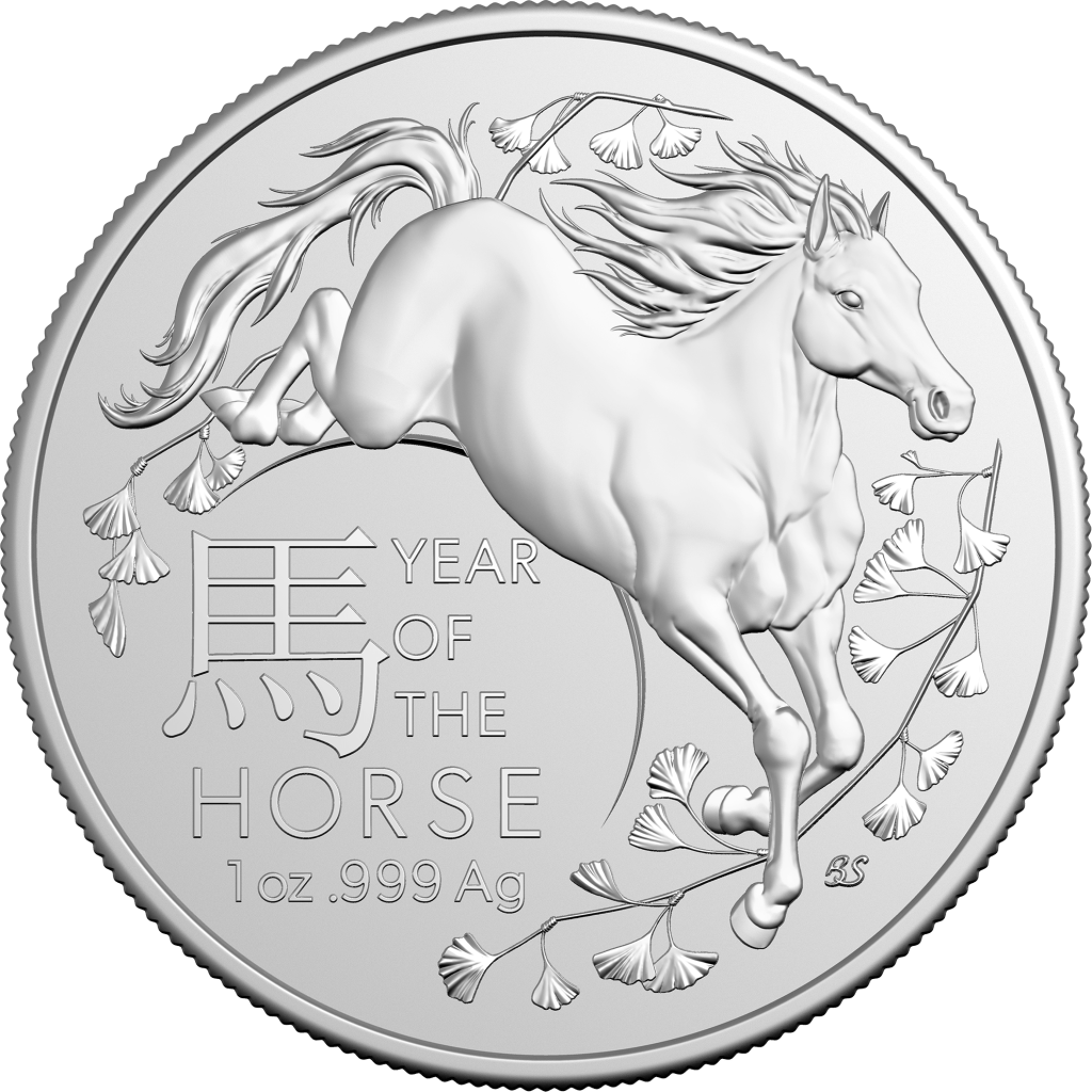 На реверсе первой монеты изображена свободолюбивая лошадь среди листьев гинкго, символизирующая надежду, силу и стойкость. Под лошадью слева размещён китайский иероглиф, означающий саму лошадь как животное китайского зодиака и соответствует земной ветви. Также надпись YEAR OF THE HORSE (ГОД ЛОШАДИ).