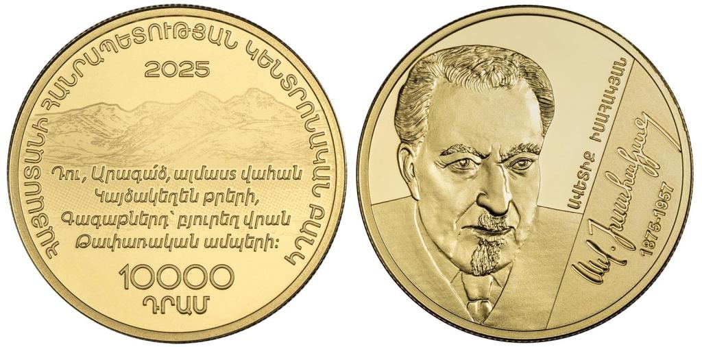 Национальный банк Армении 01 октября 2025 года представил памятную золотую монету «150-летие со дня рождения Аветика Исаакяна».
