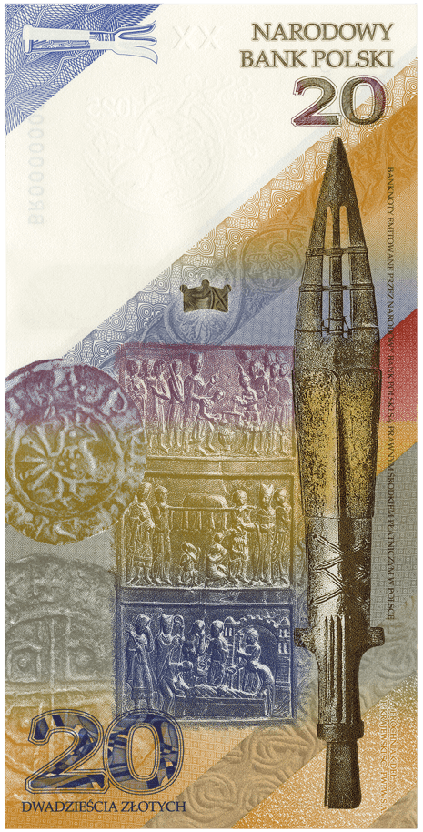 В правом верхнем углу реверса размещена надпись NARODOWY BANK POLSKI, ниже — число 20. В центре показан фрагмент Гнезненских ворот со сценами выкупа тела святого Адальберта Болеславом Храбрым, переноса и погребения его останков в Гнезно; над композицией — вырезанное окно в форме короны. Справа изображена копия наконечника копья святого Маврикия, а вдоль края вертикально, под углом 90°, размещена надпись о законном платёжном средстве Национального банка Польши. Слева представлен фрагмент аверса и реверса монеты Польский денарий. В левом нижнем углу указано число 20 и надпись ДВА ЗЛОТИХ. В левом верхнем углу, под углом 90°, на просвет видна гильза наконечника копья из Нетно, заполнение которого находится на лицевой стороне банкноты.