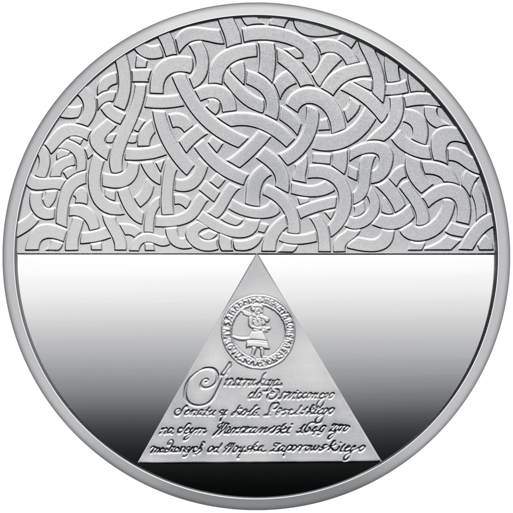 На реверсе монеты воплощена концепция дипломатии как тонкого искусства баланса и взаимодействия. В верхней части сложное переплетение линий визуализирует многослойность и запутанность международных связей, где каждое достижение является результатом диалога, взаимных уступок и ответственности. Геометрическая устойчивость треугольника символизирует прочный фундамент, на котором строится вся дипломатическая деятельность. Центральным же и наиболее весомым элементом выступает точная прорисовка оттиска печати Войска Запорожского 1648–1649 годов. Этот исторический артефакт служит мощным напоминанием о глубоких корнях и давних традициях украинской дипломатической практики, уходящей в века собственной государственности.
