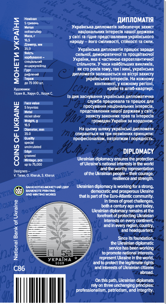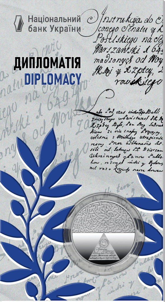 Памятная монета посвящена дипломатии — искусству проведения внешней политики, в котором реализуются национальные интересы через диалог, переговоры и поиск ответственного баланса между принципами государства и требованиями политического момента. Она является фундаментальной частью государственного строительства, обеспечивая позиционирование Украины в системе международных отношений, утверждая её суверенитет и укрепляя международную субъектность и безопасность.