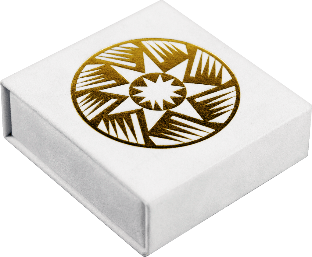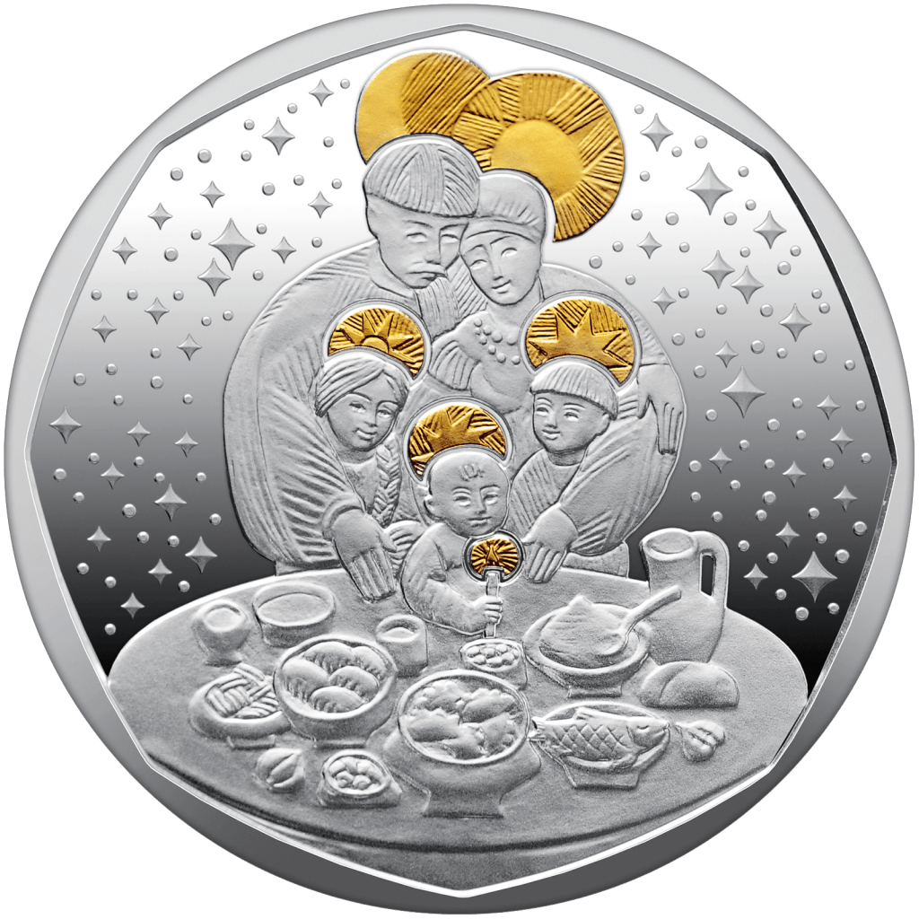 На реверсе монеты запечатлена трогательная и наполненная уютом сцена традиционной предрождественской трапезы украинской семьи. Образы отца, матери и детей, чьи головы украшены нимбами с локальной позолотой, символически отождествляются с небесными светилами, подчеркивая сакральность и чистоту семейного очага в этот святой вечер. Перед ними накрыт праздничный стол с двенадцатью обязательными постными блюдами: здесь и главная кутья, и вареники, и пампушки, и рыба, и другие исконные угощения, а также головки чеснока, служащие древним оберегом и символом здоровья. Вся композиция пронизана духом ожидания чуда, единения поколений и светлой радости праздника.